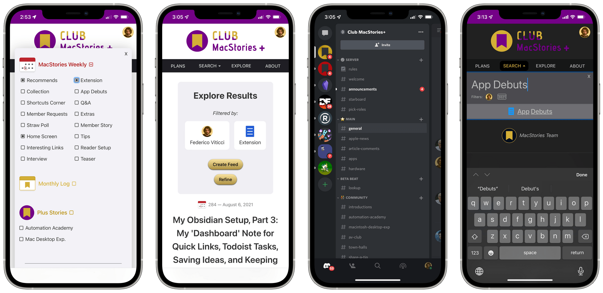 - Club MacStories+: Everything Club MacStories offers, plus new in-depth feature stories, a custom-built web app for filtering, searching, and delivering your favorite Club content, our Discord community, a place to meet other MacStories readers and participate in activities and events with the MacStories team, and a rotating collection of discounts on apps and services.