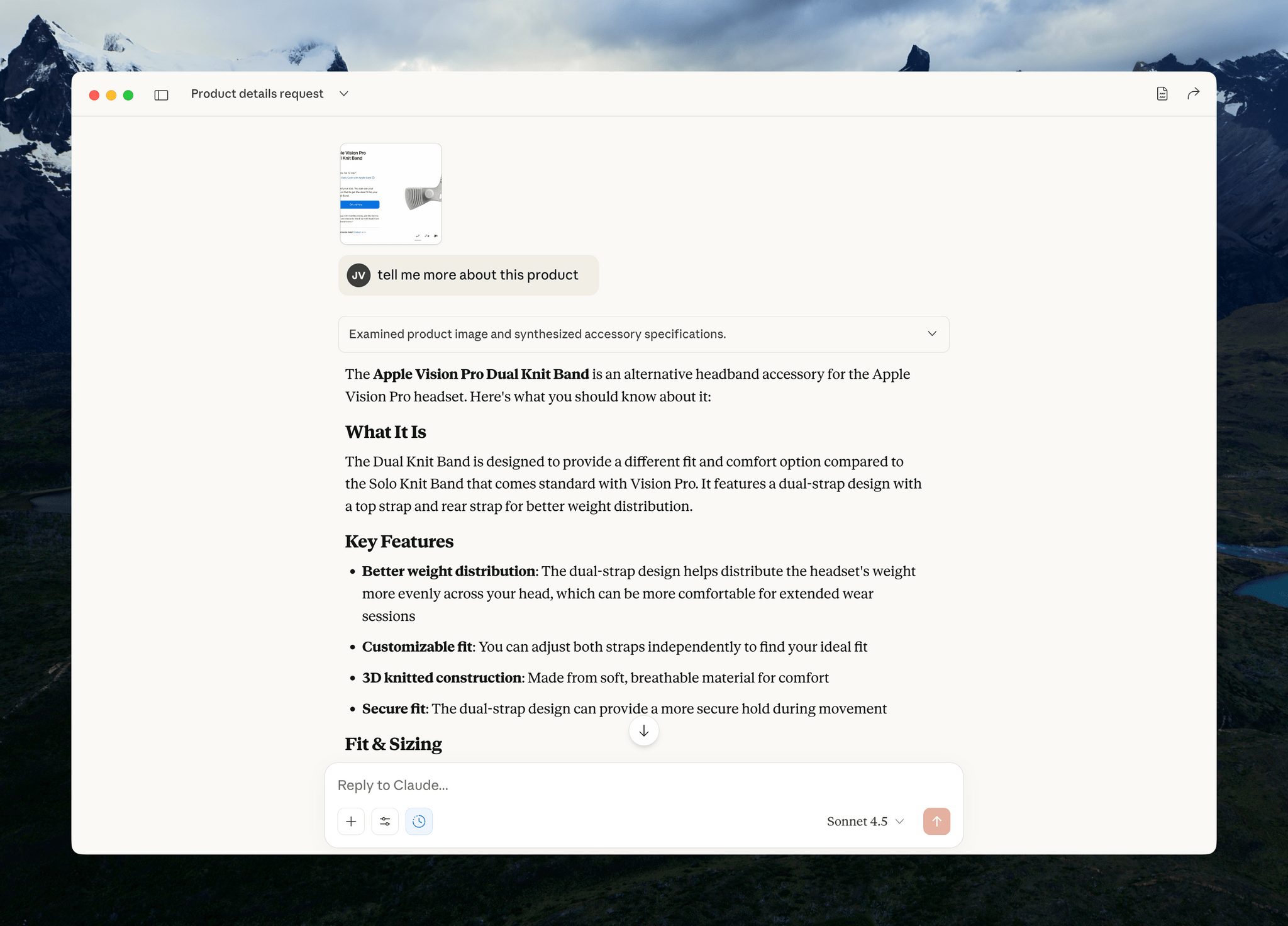 First, after giving screenshot and accessibility permissions to Claude, you can double tap the Option button to activate the app’s chat field as an overlay at the bottom of your screen. The shortcut simultaneously triggers crosshairs for dragging out a rectangle on your Mac’s screen. Once you do, the app takes a screenshot and the chat field moves to the side of the area you selected with the screenshot attached. Type your query, and it and the screenshot are sent together to Claude, switching you to Claude and kicking off your request automatically.