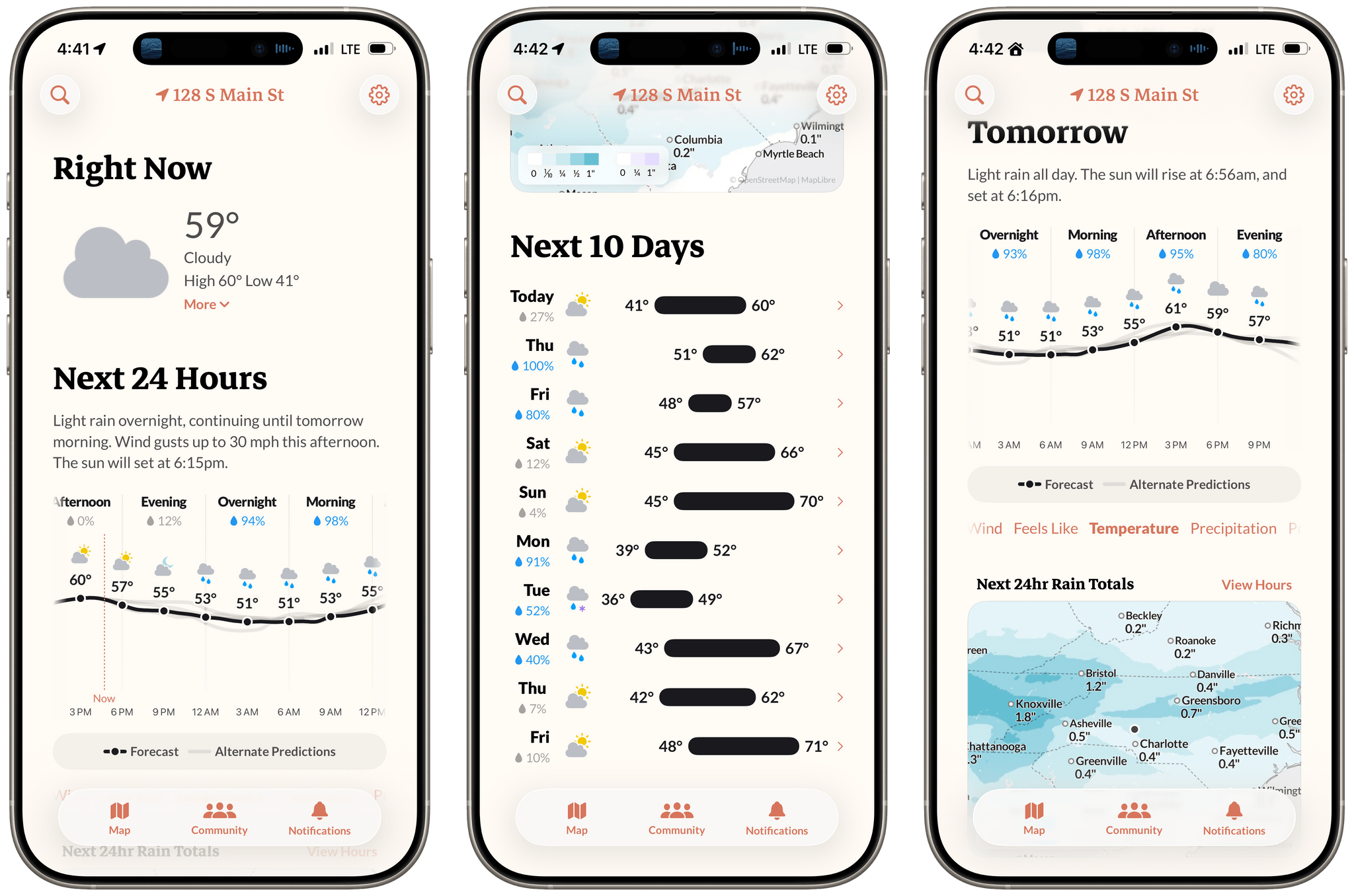 The first feature that distinguishes Acme Weather makes an appearance in the next section, where the app shows the hourly forecast. If you’ve ever opened multiple weather apps and noticed a wide range of forecast conditions, you know that weather data is inherently imprecise. It’s based on prediction models that vary by provider, and when an app uses just one model, you end up with a false sense of certainty.
