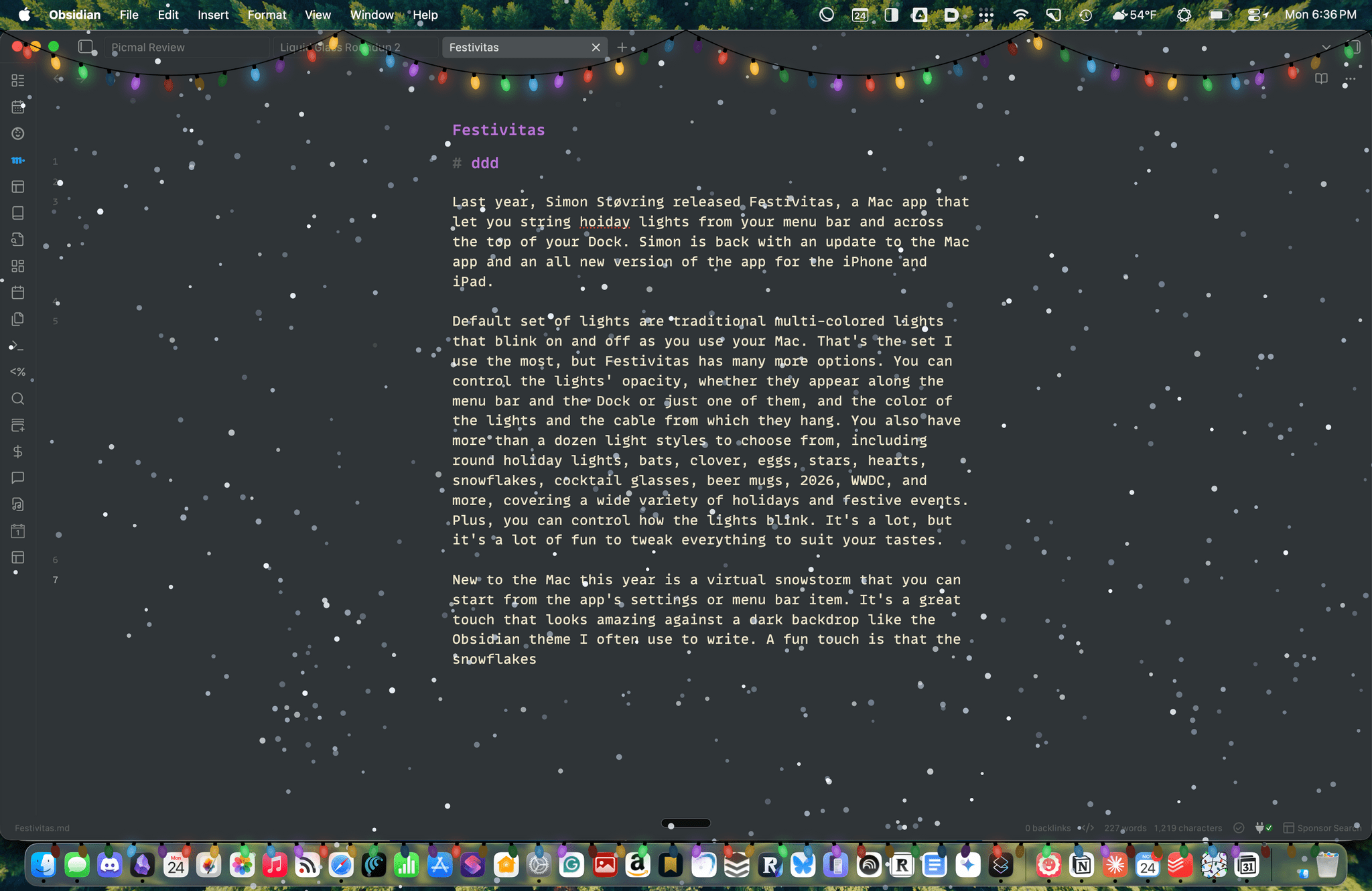 This year, the Mac app adds a virtual snowstorm that you can start from the app’s settings or menu bar item. It’s a great addition that looks amazing against a dark backdrop like the Obsidian theme I often use to write. A fun touch is that the snowflakes avoid your pointer, and you can adjust the sensitivity of this feature in settings. You can also use your pointer to push around the lights hanging from the menu bar, which is handy for those times when they obscure Safari’s menu bar or other content.