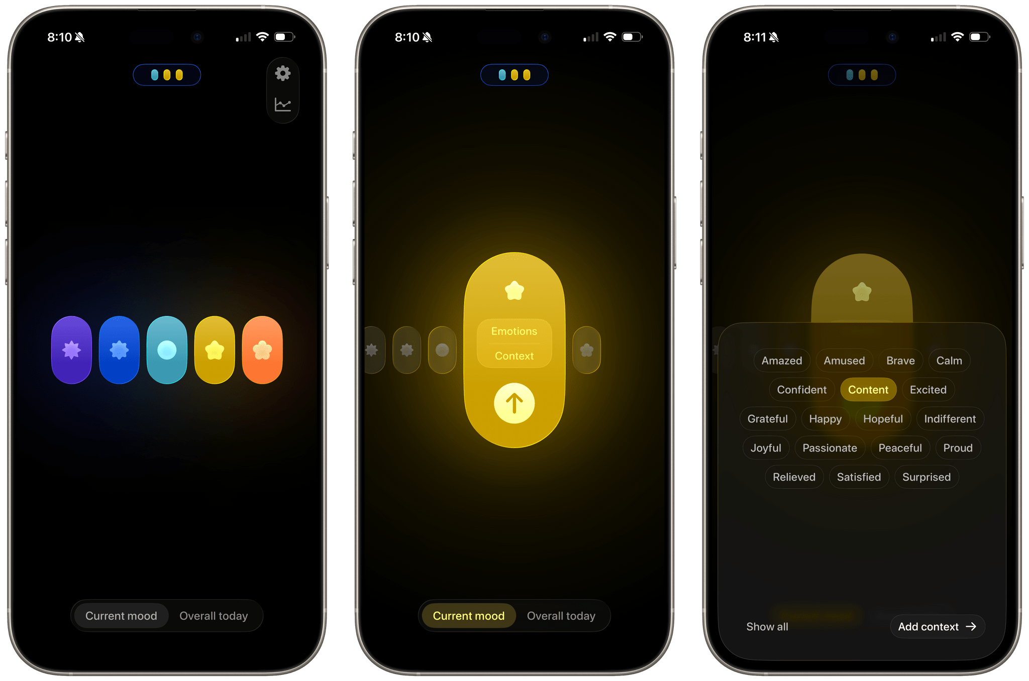 I love every aspect of this app. From the moment you open it, all you see five colored ovals with shapes inside them by default. Each represents a mood and at the bottom of the screen is a control for switching between your current mood and your overall mood. That’s it.