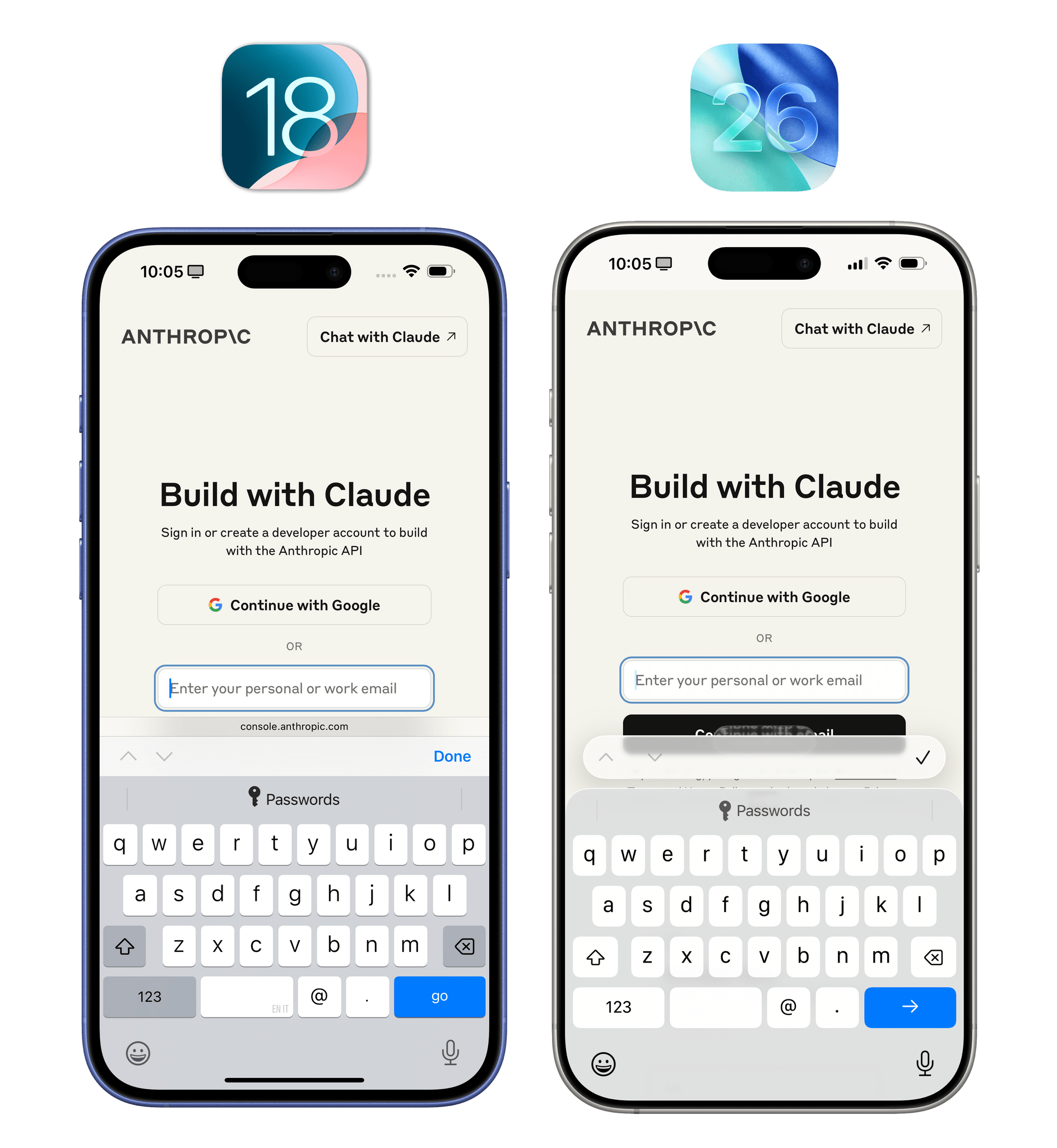 The most basic test to get a sense of all these ideas together is a simple one: logging into a webpage in Safari. Compare and contrast the same action between iOS 18 and 26: