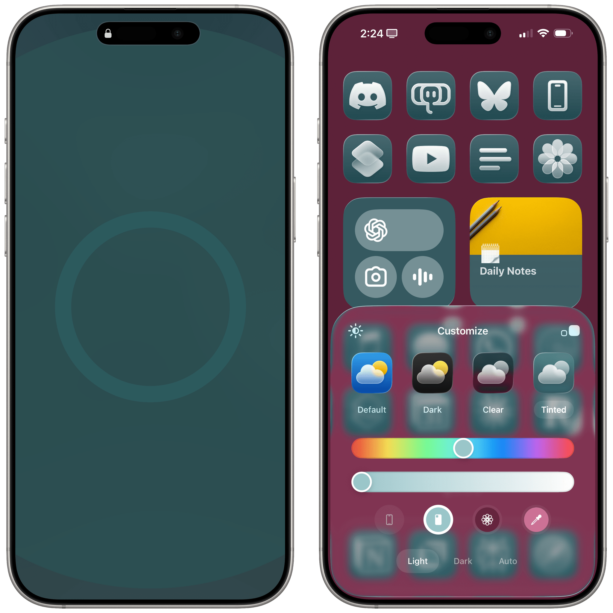 Last year, I (and many others) lamented the fact that tinted icons looked terrible. I couldn’t understand why Apple decided to tint the glyphs inside each icon and keep the icon background always dark rather than the other way around. The company listened: in iOS 26, you can now choose between light and dark tinted modes. The dark mode carries over from last year, and it still looks awful; not even Liquid Glass can save it. The new light tinted mode, on the other hand, is hot. Icon glyphs stay in an off-white color while the rest of the icon changes hue based on the usual color and intensity sliders.