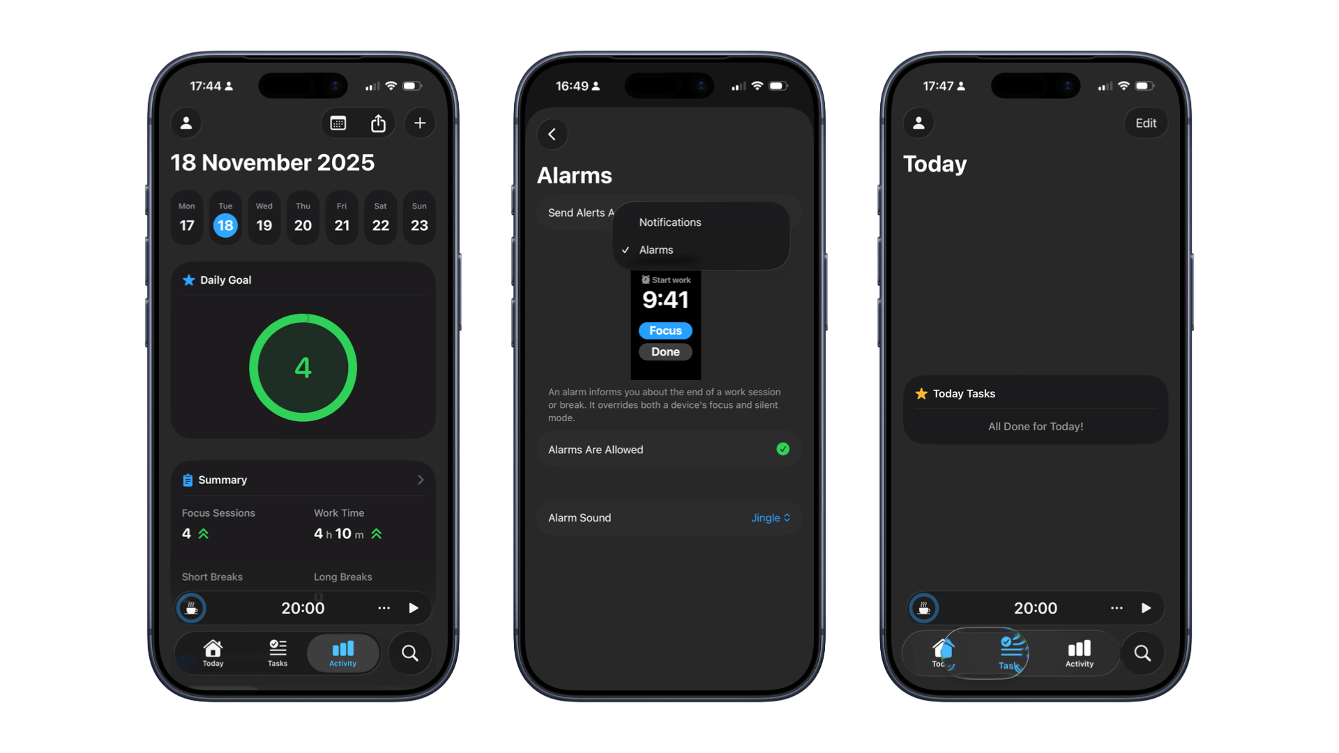 Firstly, Focus now integrates with the new alarms API, so users can be notified with full-screen alarms when it’s time to finish an interval. If you prefer classic notifications, you can still use them, but alarms work well for interval work, especially if you get distracted during a break. I’ve found it immensely valuable at times.