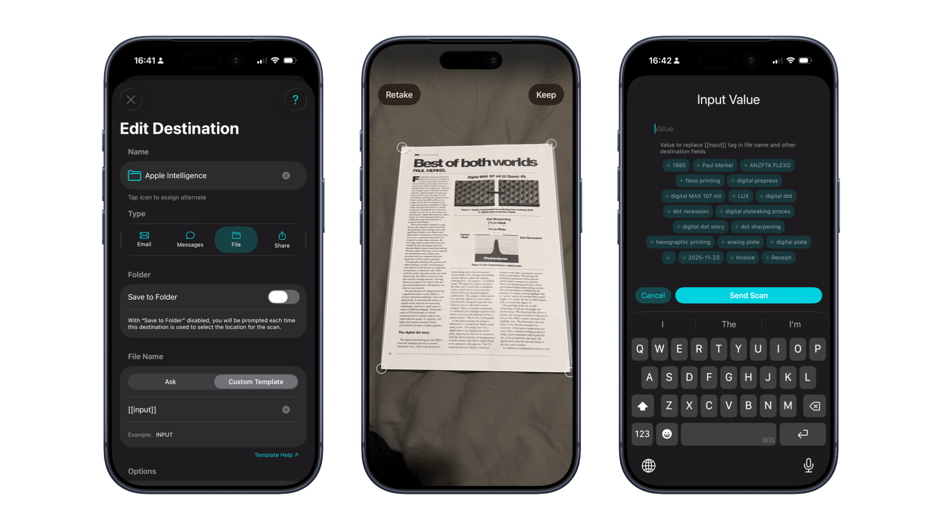 Simple Scan now supports a workflow where, if you enter [[input]] in the File Name field of one of its custom destinations, the app will use the on-device Apple Intelligence model to offer file name suggestions based on the text in the document you’re scanning. You’re presented with many options to choose from, and you can tap them to add them to the file name.