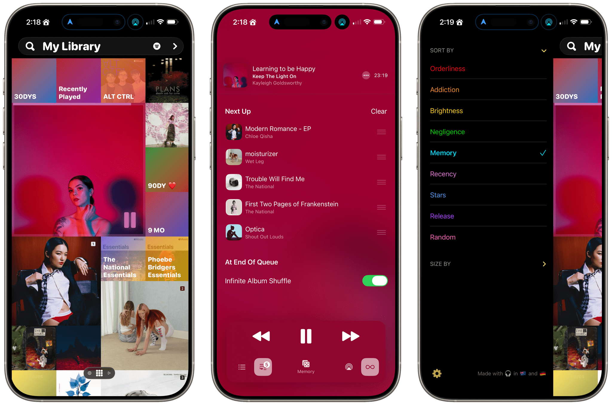Longplay has three primary views. Your home base is the collection of albums that appear in a mosaic-like layout, visually emphasizing the album that’s playing. Swipe left, and a small Liquid Glass indicator appears near the bottom of the screen showing the views available to either side of the album view. That left swipe takes you to your playback queue, which offers several ways to organize your listening session. Head back to the home view and swipe right to reveal sorting options and settings. It’s an incredibly smooth, natural interaction model that is enhanced by Liquid Glass’ fluid animations.
