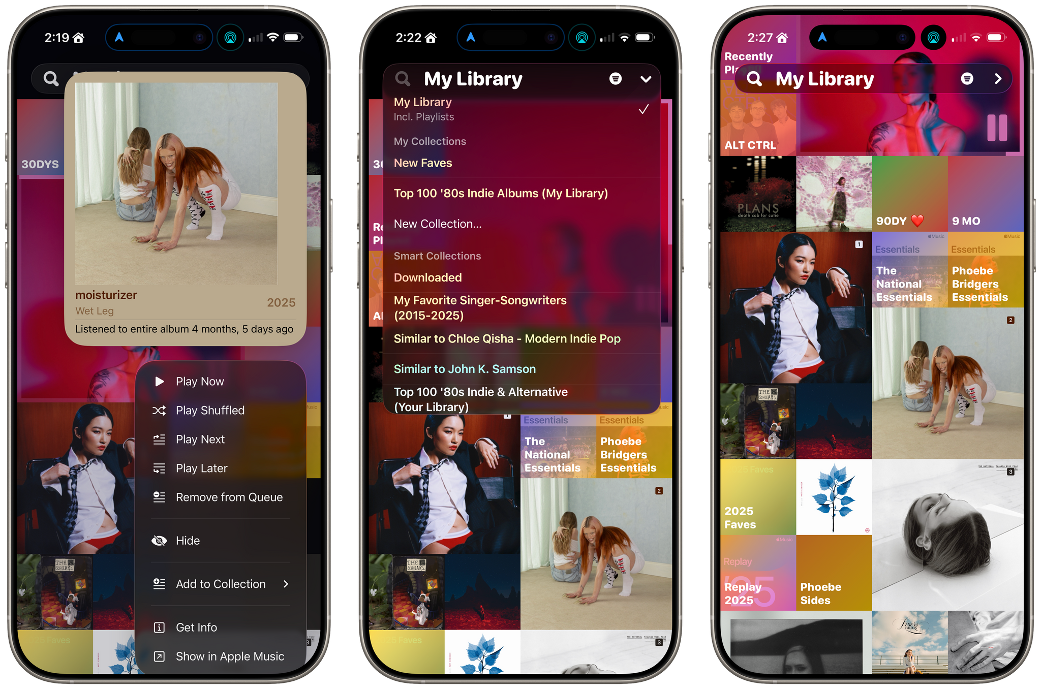 Liquid Glass is on full display across the top of Longplay’s main view, too. From here, you can search for an album or playlist or open a dropdown menu to switch between your Apple Music library and the collections you’ve created. The search bar is transparent but legible, and as you scroll, it disappears entirely, highlighting your music collection. Longplay also makes great use of modern context menus, tucking extensive controls and metadata out of the way while keeping them fully accessible.