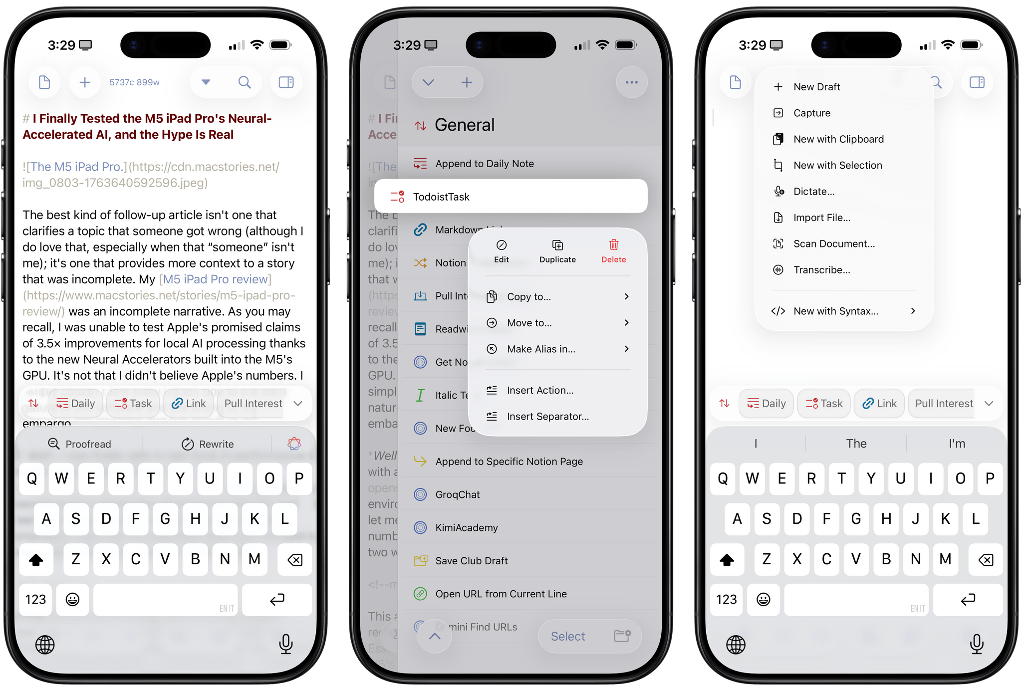 Over the past two months, Drafts has received a series of notable updates for the 26 family of OSes. The app has been updated for Liquid Glass, which I think pairs well with Drafts’ UI, but more importantly, it’s also been optimized for iPadOS 26. That means full integration with the menu bar, multi-windowing, and keyboard shortcuts. Greg Pierce has done a solid job integrating with App Intents: Drafts actions can now be triggered from Control Center on the Mac and Apple Watch, and there’s a new ‘Show Capture’ action in Shortcuts that opens the app’s Capture window with the ability to pre-fill some text in it. Last but not least, Pierce also added support for the on-device Foundation model, which can be invoked from Drafts’ JavaScript-based scripting library to access tools that let you query drafts, create new ones, and more.