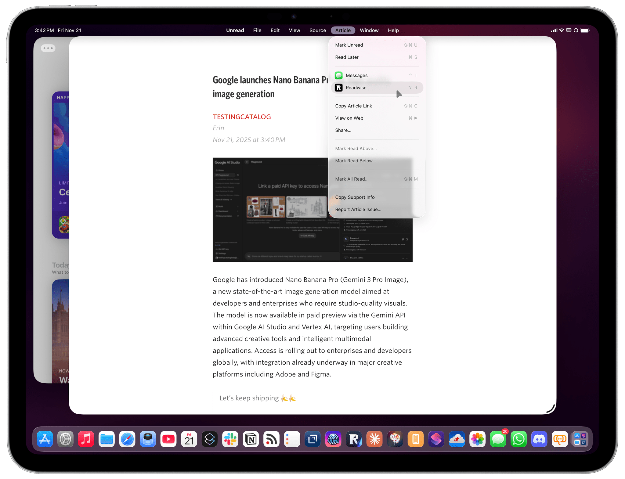 Today, I want to specifically call out the app’s iPadOS 26 updates. A couple of months ago, developer John Brayton completely rethought the app’s keyboard shortcuts to account for the new ones Apple added to the system and, most importantly, the menu bar. Unread has fully embraced the menu bar in iPadOS 26, creating one of the richest implementations of this feature I’ve seen to date. In addition to managing feeds and subscriptions with new menu items and keyboard shortcuts, my favorite touch in Unread’s menu bar is the ‘Article’ menu, which lets you add direct integrations for specific apps (such as GoodLinks, Messages, and Readwise Reader) that will show up as colorful icons in the list. They can be assigned custom keyboard shortcuts too.